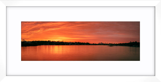 A sublime reddish sunrise captured at Breakfast Point on the Parramatta River. The ferry arriving at Cabarita Point wharf is blurred by the long shutter speed. The technique also renders the river into a glasslike reflection and softens the cloud texture.